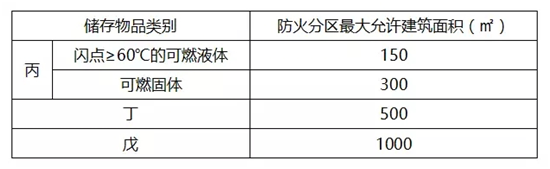 4、丙、丁、戊類物品庫房的防火分區允許最大建筑面積應符合下表的規定。當設置有火災自動報警系統和自動滅火系統時,允許最大建筑面積可增加1倍;局部設置時,增加的面積可按該局部面積的1倍計算。