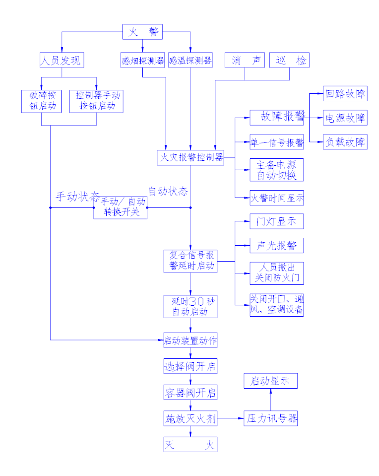 當兩種探測器發出火災信號時,控制主機啟動室內、外聲光報警器,聯動關閉防護區開口,進入滅火啟動延時,達到設定的延時時間后,自動啟動滅火裝置,發出滅火指令,打開電磁閥釋放氣瓶氣體,氣瓶氣體通過啟動管路打開滅火劑容器閥釋放滅火劑,實施滅火。
