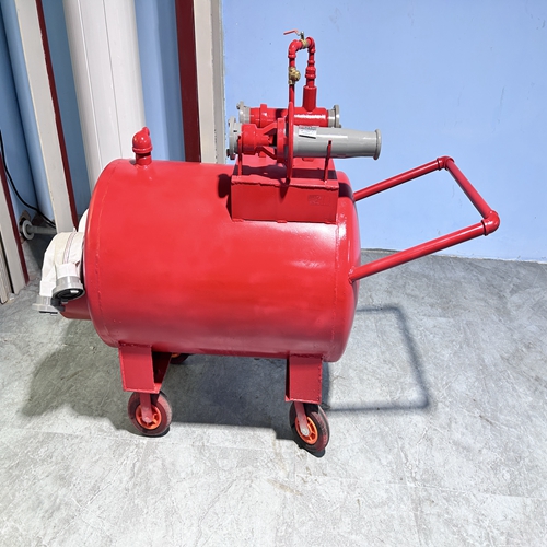 半固定式(輕便式)泡沫滅火裝置主要由常壓泡沫液儲罐、泡沫槍、管線比例混合器、消防水帶、及推車車架等構成。