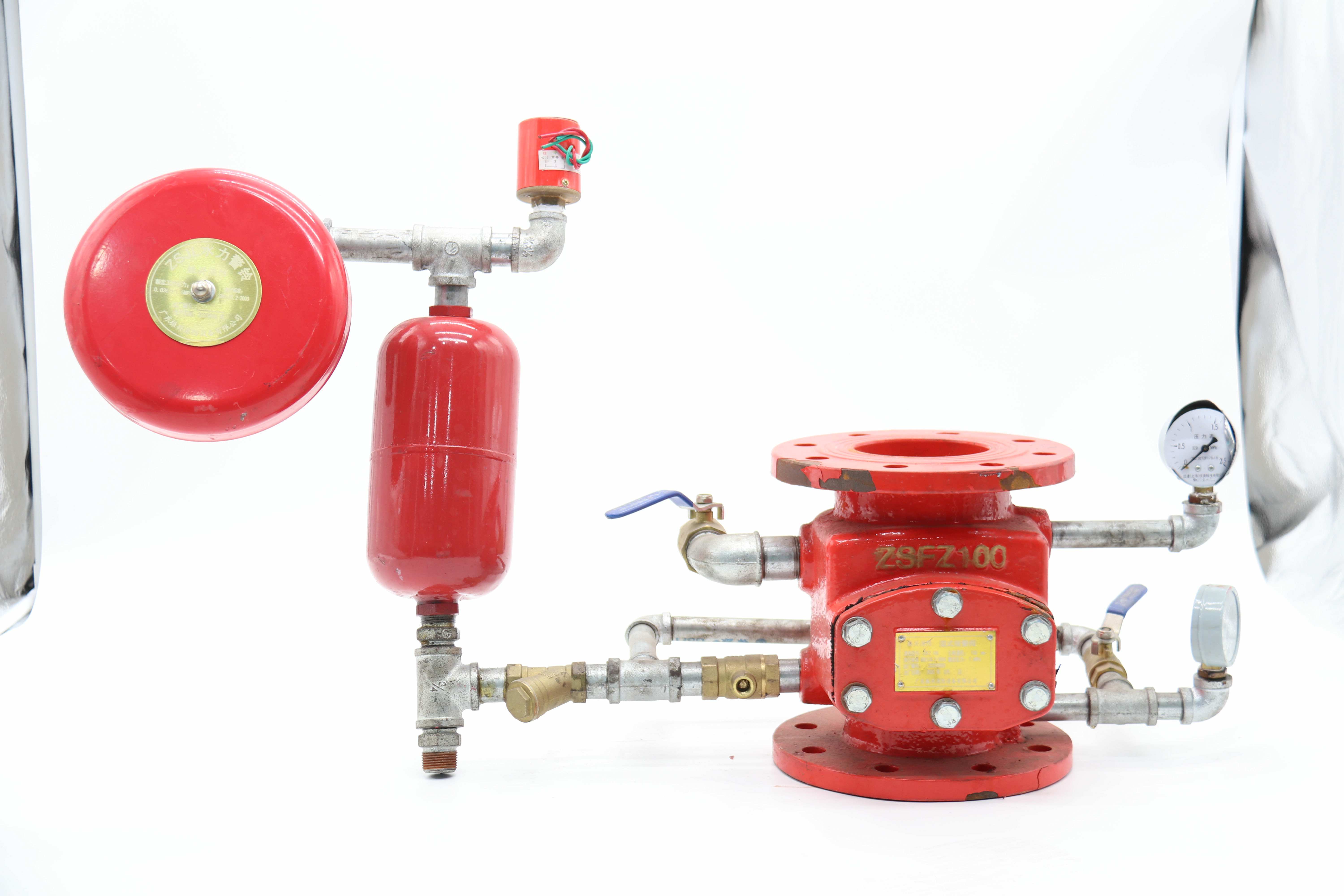 當主閥開啟后,水流進過中間腔和延時器流向水力警鈴和壓力開關(guān),在一定的水流壓力下,推動葉輪帶動鈴錘轉(zhuǎn)臂旋轉(zhuǎn),使鈴錘連續(xù)擊打鋁鈴而發(fā)出報警鈴聲;同時壓力開關(guān)閉合,向消防泵發(fā)出啟動信號。
